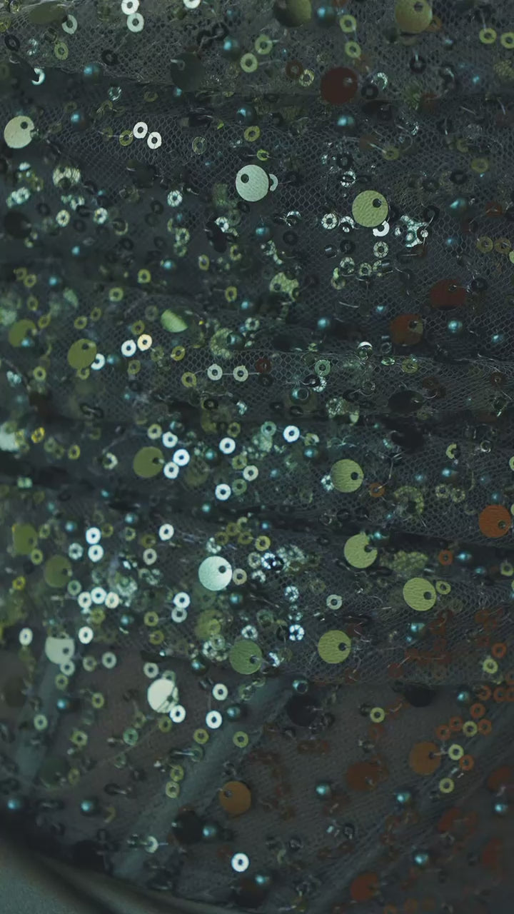 Natur trifft Glamour. Dieses olivgrüne Kleid mit schimmernden Details und schulterfreiem Ausschnitt ist erdige Eleganz in ihrer schönsten Form.